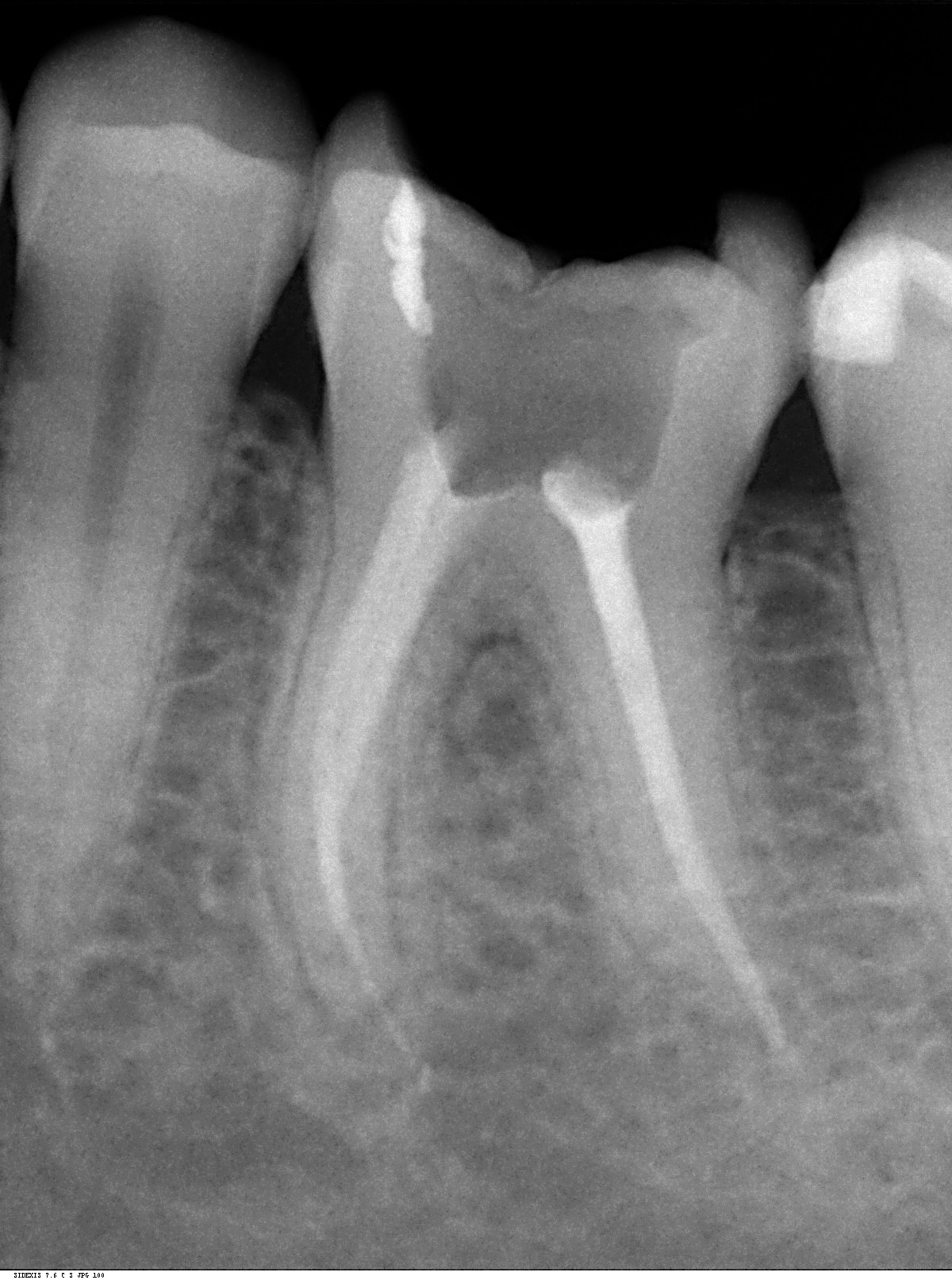 In der Behandlungsfolge wird der Wurzelkanal eröffnet, erweitert, gereinigt und abschließend mit einer Wurzelfüllpaste bakteriendicht verschlossen.
